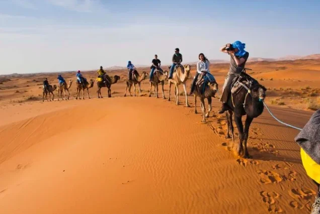 Despertamos temprano para ver amanecer en la duna más cercana, del campamento. Tiempo libre para sacar fotos mágicas, y disfrutar del silencio de este desierto de Zagora. Y luego desayuno rico en el restaurante, después hay opción de volver en coche hasta el asfalto o en camellos donde nos espera el vehículo para coger el camino de regreso a Marrakech, continuando nuestra ruta en dirección a La Kasbah de Ait Ben Haddou, (Una fortaleza antigua del siglo XI, declarada patrimonio de la Humanidad). Atravesando las montañas del Anti-Atlas, por el puerto de Tizi-N Tinifift. Sobre las 12h aproximadamente llegaremos al famoso pueblo «Ait Ben Haddou», tiempo libre para visitar la Kasbah y almorzar, a la tarde regreso hacia a MARRAKECH. Cruzando el Alto Atlas viajando a la ciudad roja de Marruecos (Marrakech), traslado hasta dónde podemos llegar con el coche y fin de nuestro servicio de excursión de 2 día y 1 noche desde Marrakech al desierto de Zagora