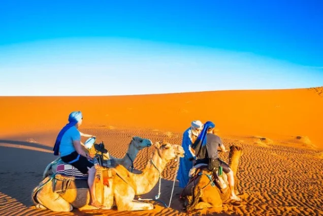 Nos despertaremos iremos a desayunar a las 08 de la mañana salida desde el hotel hacia marrakech de excursión de 4 dias y 3 noches desde desierto de Merzouga, pasando por Rissani, una de las ciudades más antiguas de Marruecos y capital de la dinastía Alaouite allí haremos una parada a la salida del pueblo para sacar la foto de la puerta del desierto, y atravesando los áridos y al mismo tiempo interesantes paisajes pre-desérticos hasta llegar al Valle del Draa donde realizaremos una parada para disfrutar de este precioso valle que discurre junto al río que lleva el mismo nombre. Es el río más largo de Marruecos y cruza todo el país hasta Mauritania y otra parte llega hasta la playa blanca. cruzaremos el Anti Atlas (Ait Saouen) para llegar a Ouarzazate, almuerzo en un restaurante típica de la ciudad . por la tarde cruzaremos el Alto Atlas hasta llegar a marrakech, os dejamos hasta dónde puede llegar con el coche y fin de nuestro servicio de excursión de 4 días y 3 noches desde Marrakech al Desierto de Merzouga Sahara Marruecos