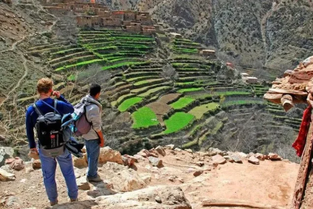 Después del desayuno salida a las 9:30 de la mañana de excursión al Valle de Ourika desde Marrakech, comienza dejando atrás Marrakech y poniendo rumbo en coche hacia la cordillera del Atlas, al Valle de Ourika, que es una región típica del Alto Atlas. Haremos una primera parada para visitar un mercado tradicional bereber en Ghmat (viernes) o TNINE OURIKA (lunes). Antes de seguir nuestro camino, visitaremos una casa tradicional bereber y aprenderemos acerca de la vida de las tribus indígenas bereberes de Marruecos (siglos 16 y 17). Podrá experimentar unas vistas impresionantes del pueblo y del valle desde el techo de la casa.